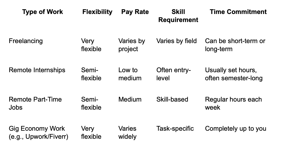 Below is a comparison of popular remote work options, which you can use as a quick reference to figure out which one might suit you the best.